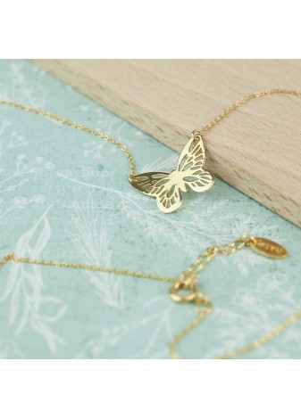 Elegancki naszyjnik z ażurową zawieszką w kształcie motyla, wykonany ze srebra próby 925 i pozłacany. Polerowany na wysoki połysk, posiada regulowany ogniwkowy łańcuszek.