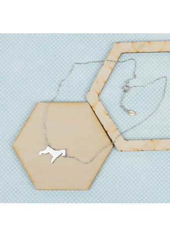 Elegancki naszyjnik z zawieszką w kształcie owczarka/charta, wykonany ze srebra próby 925, rodowany i polerowany na wysoki połysk. Regulowane zapięcie i możliwość graweru gratis.